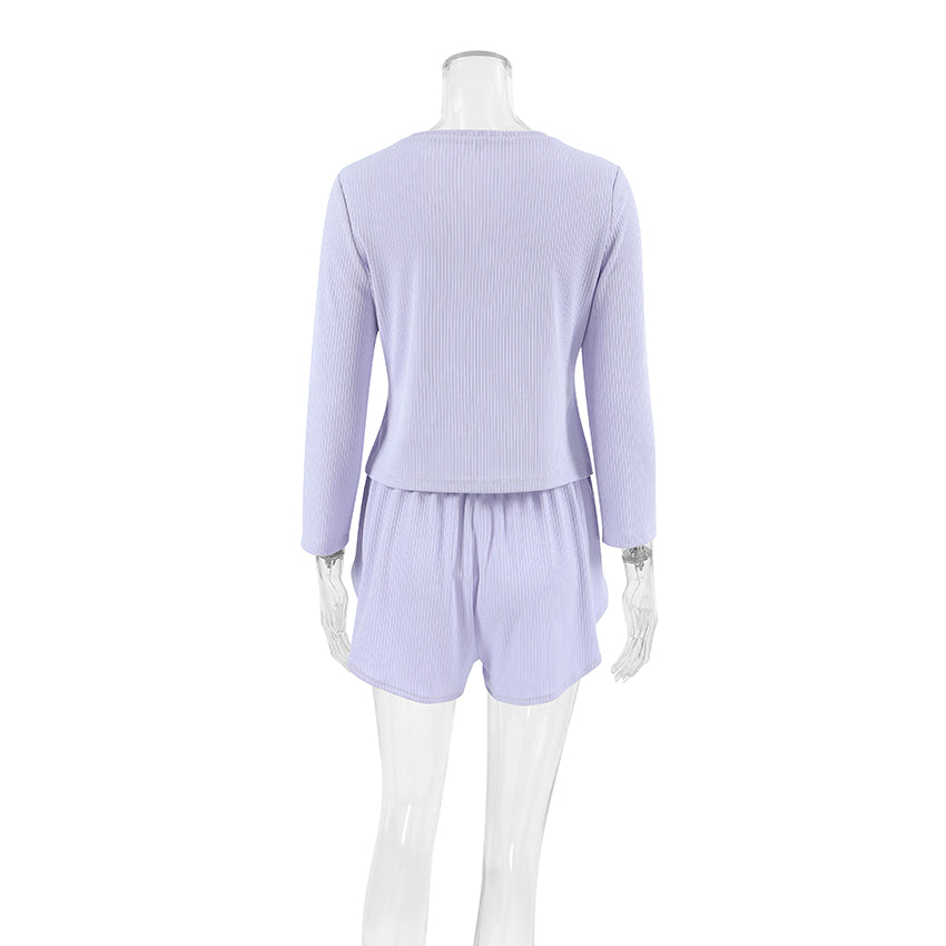 Elegant Ribbed Pajama Set –  Long Sleeve Top & Shorts