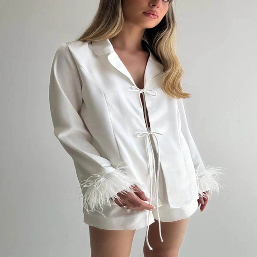 Feather Trim Satin Short Pajama Set with Tie Front