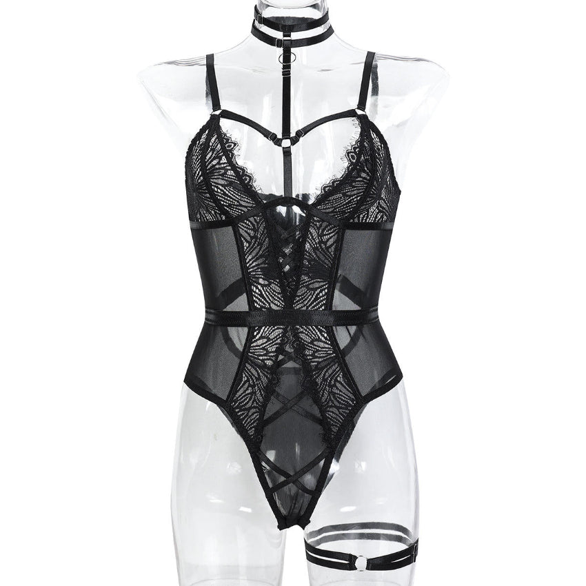 The Noir Strappy Lace Bodysuit blends modern edge with timeless allure. Crafted from delicate sheer lace and mesh, this bodysuit contours the body while creating a dramatic, feminine shape.